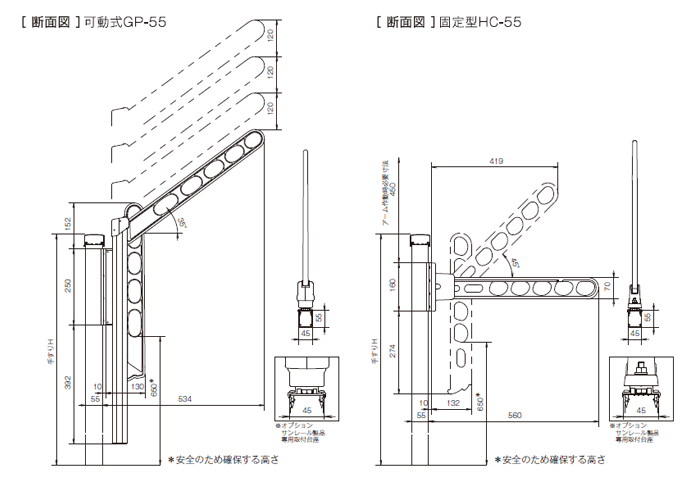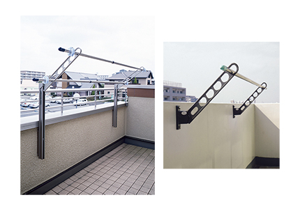 上下可動式の物干し金物です。物干しの高さは、取付金具の位置で調整可能。手すりに取り付ける固定式もあります。
